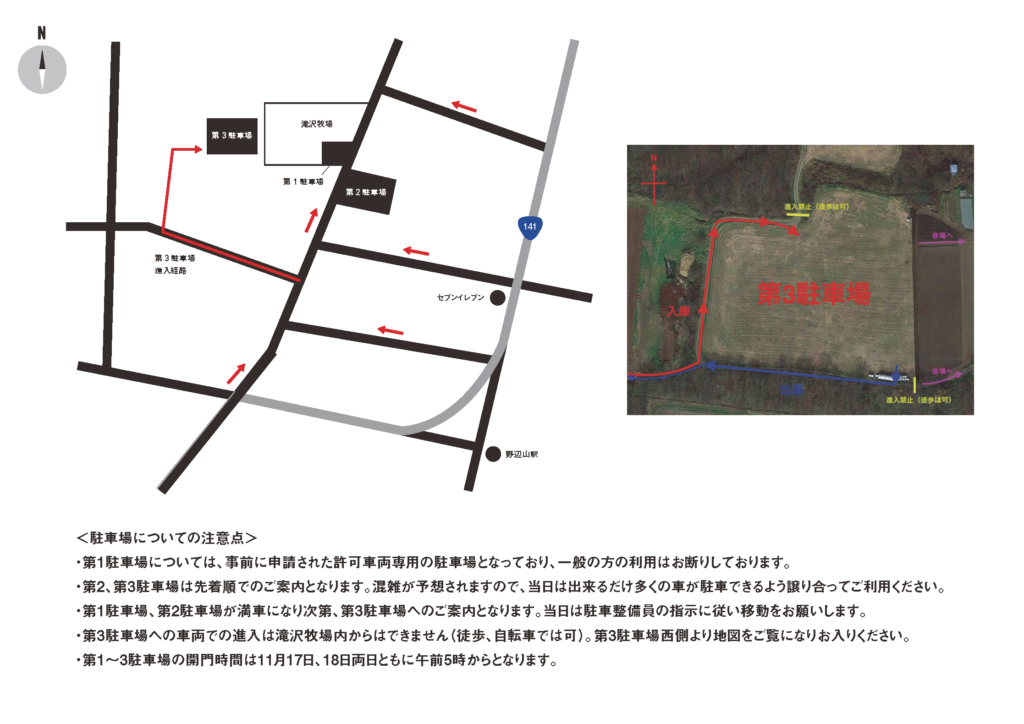 今年は以下のような駐車場配置となっています。第3駐車場は例年から変更がありますので要注意です。